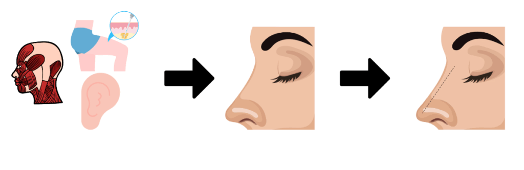 自家組織移植は、側頭筋から筋膜、大腿から真皮、耳介から軟骨を採取し、鼻の形に合わせて加工し、鼻の穴の中から挿入する方法です。