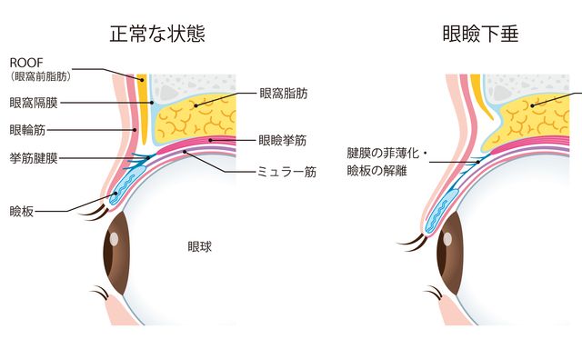 1つ目は、挙筋腱膜が伸びて菲薄化することで筋肉による上まぶたの引き上げる力が弱まり、結果として眼瞼下垂になるものです。加齢・コンタクトレンズ使用による挙筋腱膜の菲薄化、重症筋無力症・動眼神経麻痺による挙筋腱膜の機能不全が原因です。