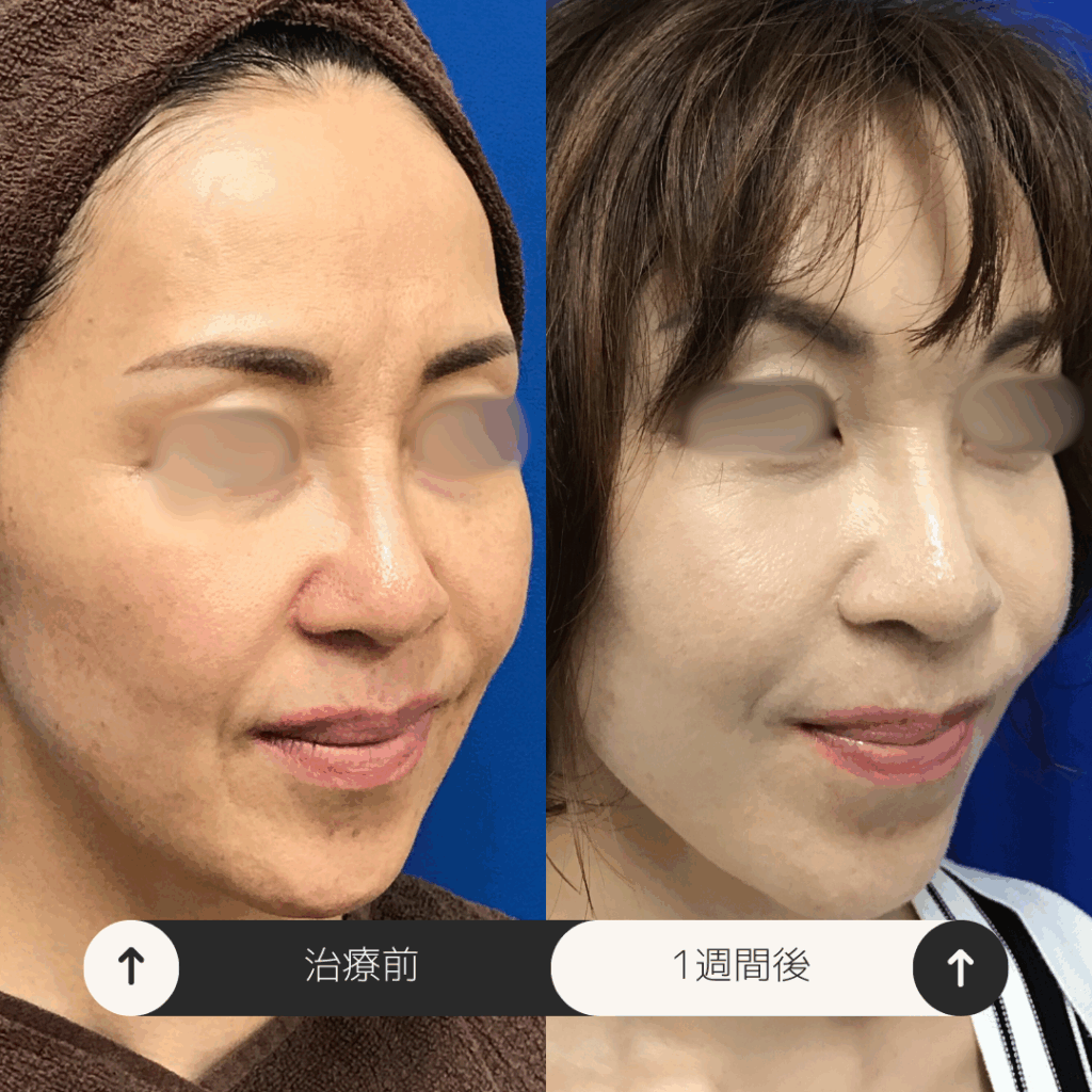 ほうれい線を薄くしたいとの希望で来院されました。フェイスラインの乱れはあまりなく、頬部分の皮下組織が下垂してしまっていることでほうれい線が濃く見えてしまっていました。そのため、中顔面を中心にリフトアップを行い、自然な形でほうれい線を解消しました。