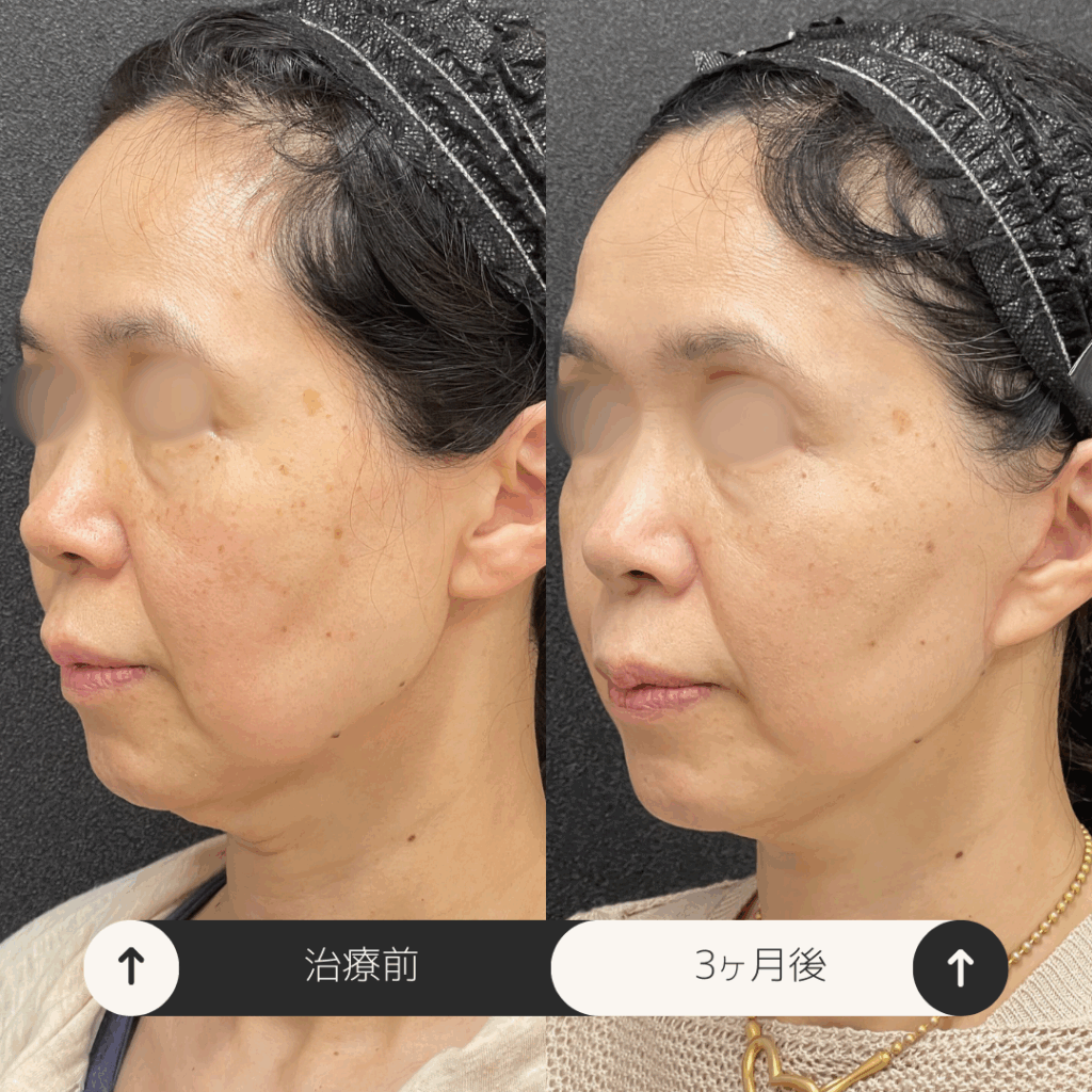 フェイスラインの乱れ、首のたるみをお悩みに来院されました。治療はしたいけれどもあくまでもナチュラルな変化をご希望でしたので、頬部分のリフトアップは最小限に抑え、お悩みであるフェイスラインと首のたるみを改善しました。