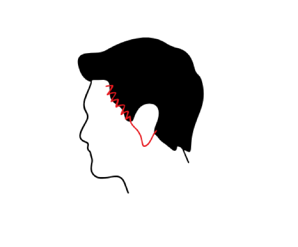 フルフェイスリフトは、こめかみから耳の前面に沿って切開し、たるんだ脂肪組織・筋肉を処理し、顔全体と顎下と首のリフトアップする手術です。