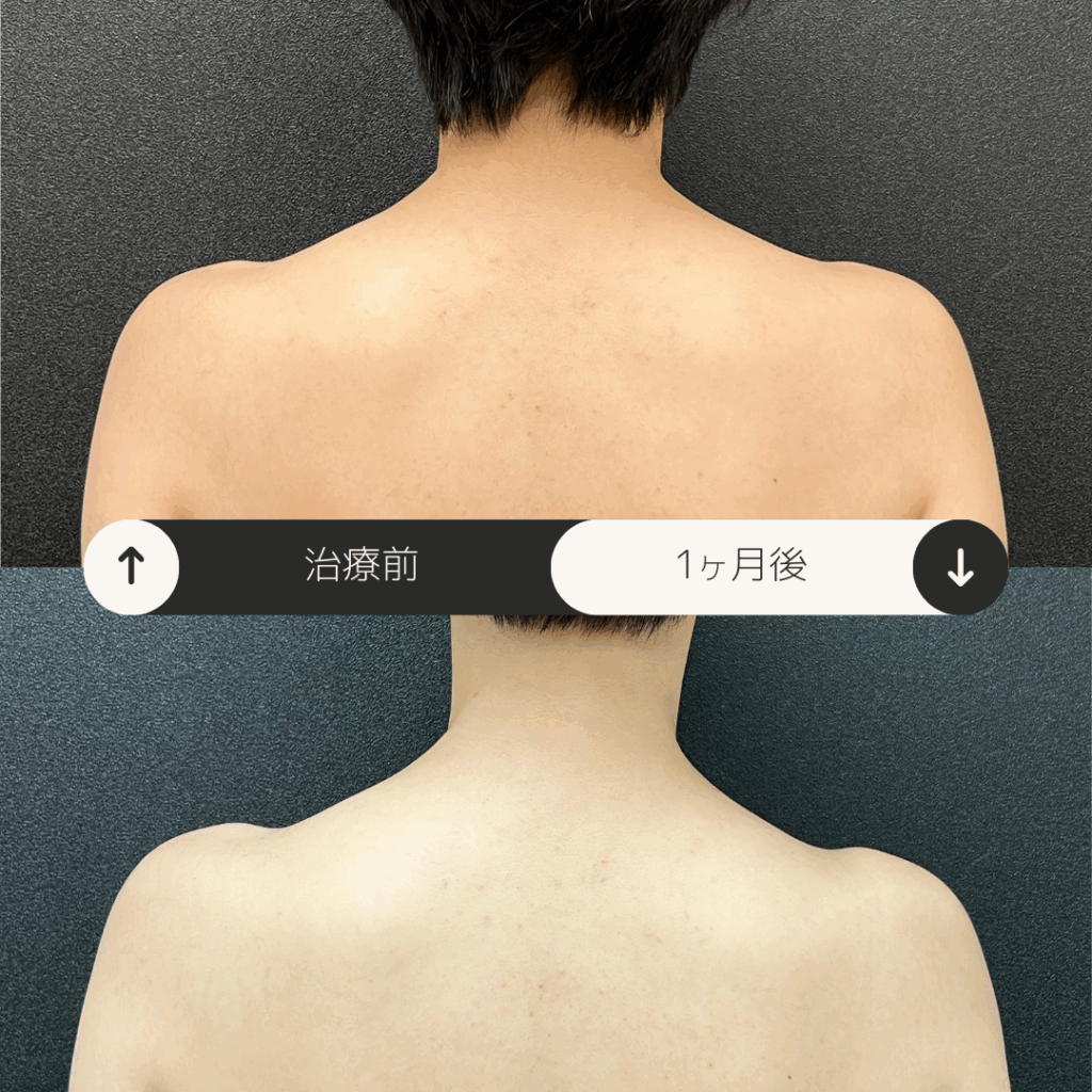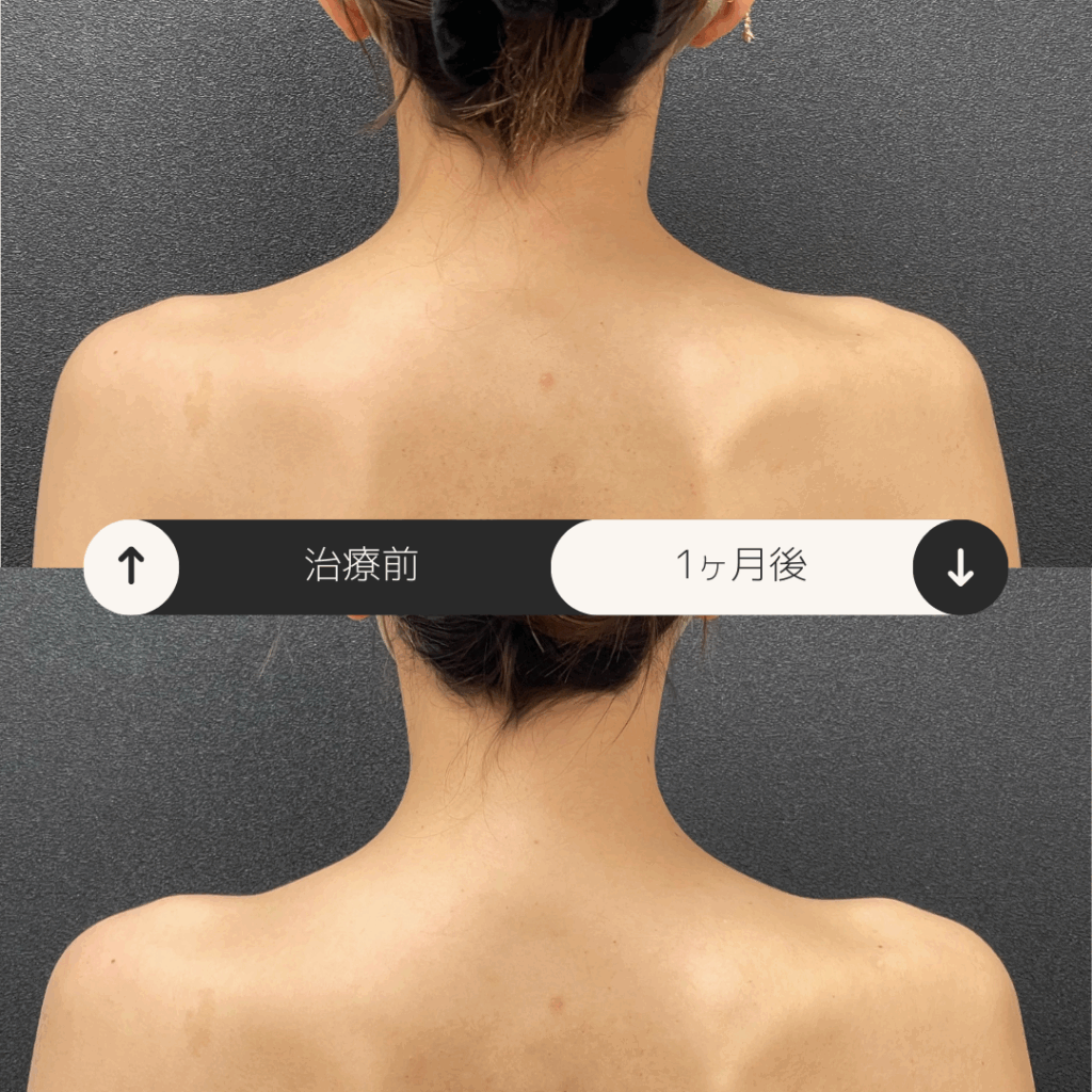 結婚式を前に肩のラインをスッキリさせたいとのことで来院されました。元々痩せ型で、綺麗なラインをしている方ですが、僧帽筋のハリにより首が短く見えてしまっていました。そのため、肩の細く見せたいラインを中心にボトックスを注入しました。