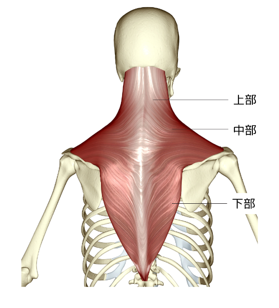 僧帽筋は解剖学的に上部・中部・下部の3つに分けられます。上部は首の後ろから肩にかけて、中部は肩、下部は背中に分布しています。