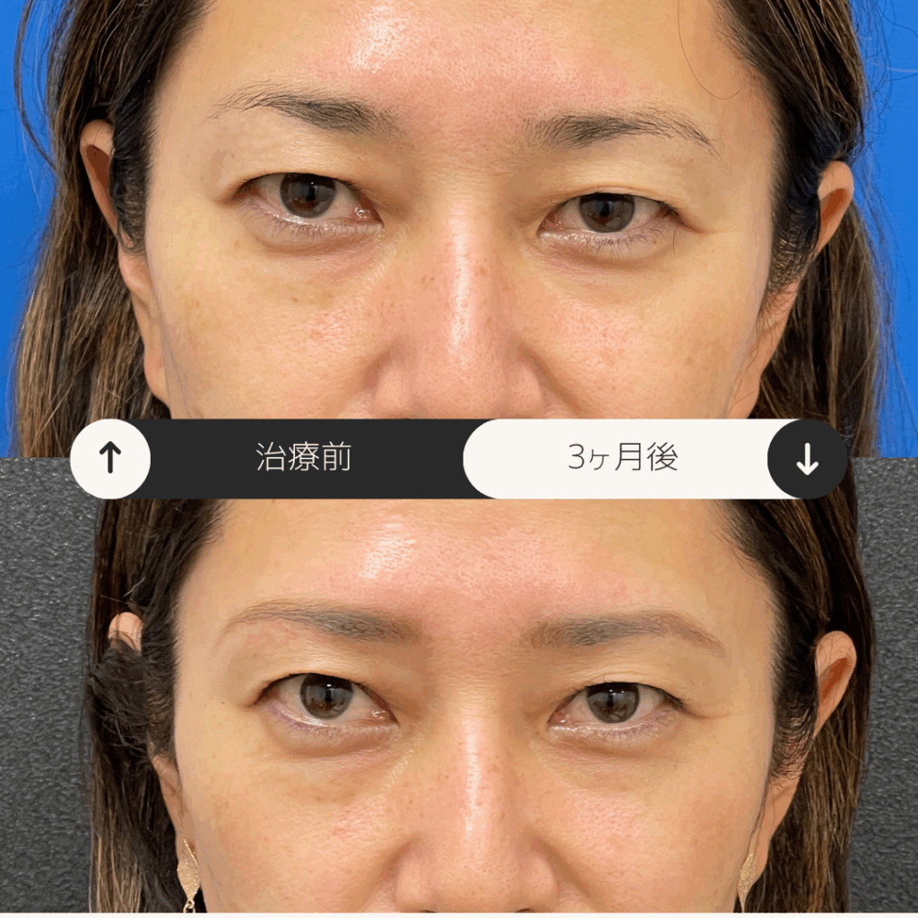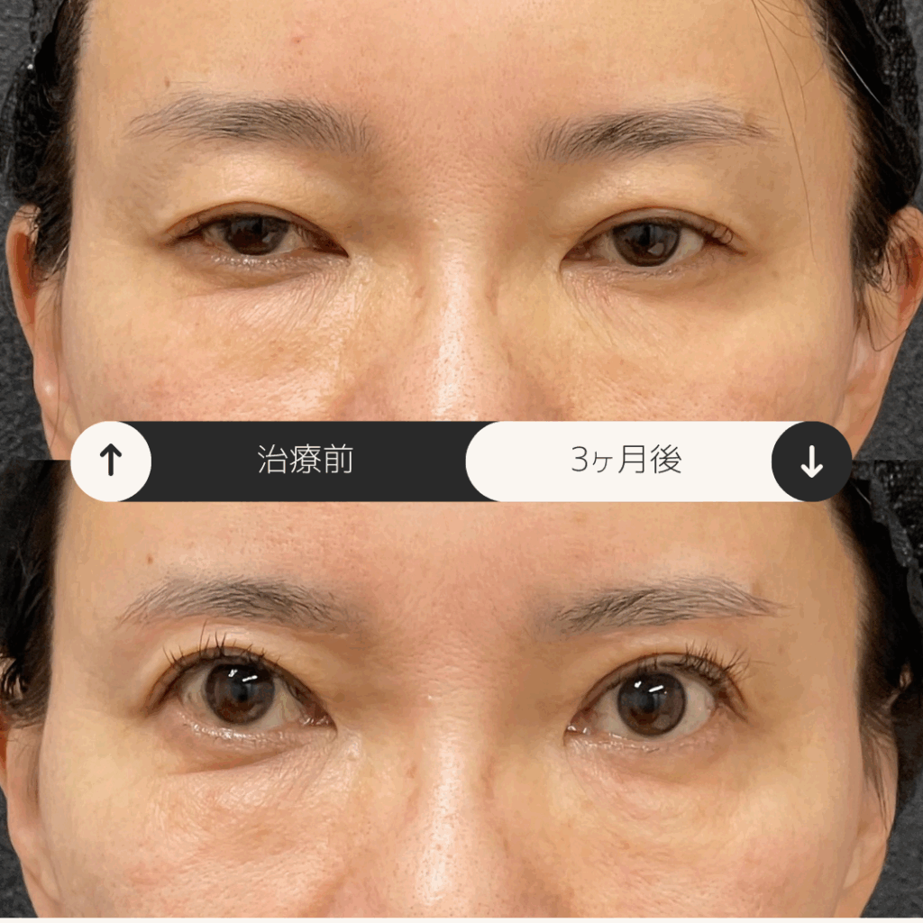 目の開けにくさ・肩こりをお悩みに来院されました。上まぶたの皮膚がたるんできていましたが、目を開ける機能自体は正常でしたので、眉毛のラインに沿って余分な皮膚を切除する眉下切開法を選択しました。治療後はご自身の綺麗な二重幅のラインが見えるようになり、マスカラが上まぶたに付かなくなったと喜んでおられました。