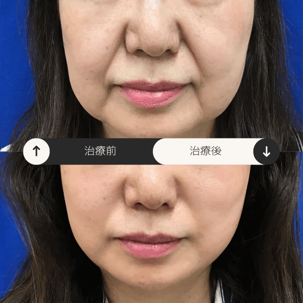 頬の肉の厚さ・たるみ、そこからくるほうれい線をお悩みに来院されました。皮下脂肪が厚く、糸リフトではすぐに後戻りしてしまうため、今回は思い切って切開リフトを提案させていただきました。しっかり中顔面までアプローチしたため、お悩みだった頬の肉の厚さやほうれい線は改善しました。