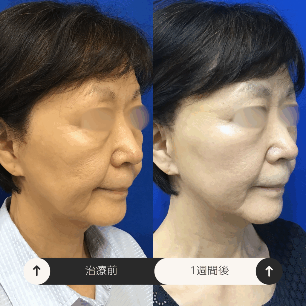 頬のたるみ・ほうれい線の目立ちを気にされて来院されました。しっかり治したいけれど、やりすぎた感は出したくない、またダウンタイムを抑えて治療を行いたいとのことで、フェイスリフトではなくこめかみリフトを選択しました。術後の皮下出血もほとんどなく、きにされていた頬のたるみ・ほうれい線は目立たない程度に改善されました。