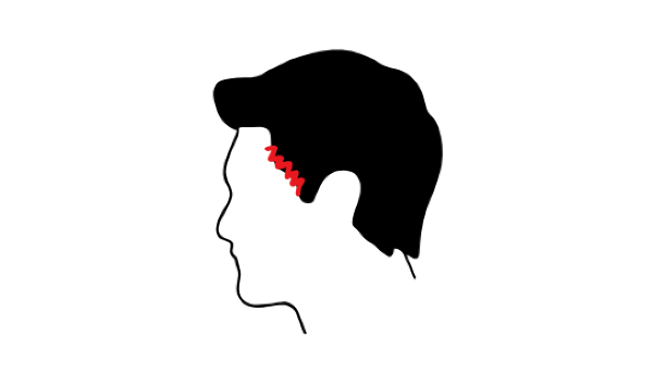 - こめかみをギザギザに切開します。切開線は、生え際に沿って置くので目立ちにくいです。