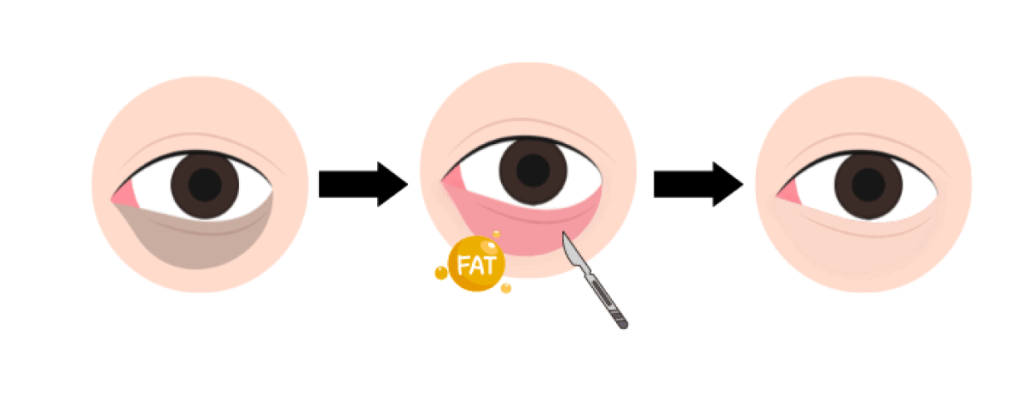 経結膜脱脂法を行い、一時的に突出している眼窩脂肪を除去し、目の下のたるみやクマを改善することはできますが、将来的に再発する可能性が非常に高いです。再発した場合には、脂肪注入など追加の治療が必要になります。